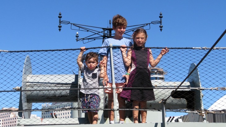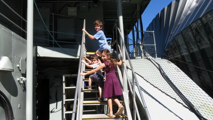 The Maritime Museum have a range of school holiday activities available, but our kids- Ethan (9), Laya (6) and little cousin Callum (2)- were most enthusiastic to explore the vessels first up. We spent a while checking out the displays (who knew they got ice-cream on board!?!) and then boarded the HMAS Vampire. This destroyer was active during the Cold War and it was amazing to see the big guns up close. The kids were wrapped to climb and explore the big ship and were happy to wander around and climb to see what was around the next bend.