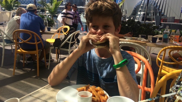 By then, it was time for lunch so we headed next door to Yots cafe. Lunches set us back about $10 each for the kids- mini burgers and chips and the kids box (vegemite sandwich, juice box, fruit, and chocolate coin) and there were plenty of good options for the adults which were around $20 each. It was getting pretty busy so the kids popped back to play whilst we waited for the food.
