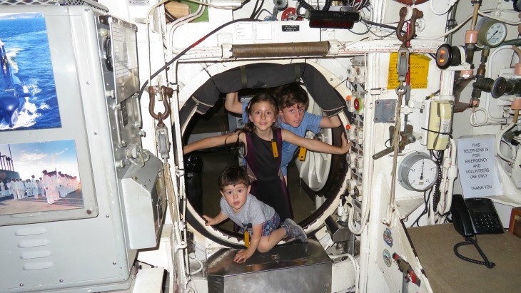 Next, we headed over to the submarine, which was a tight squeeze for the adults, but fine for the kids! The volunteers on board explained various aspects of the submarine to the kids, including the torpedo, engines and periscopes. We climbed all the way through to see the bunks, kitchen, and toilets and got a glimpse of what life at sea would be like.