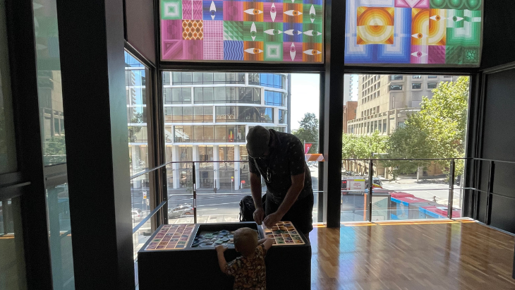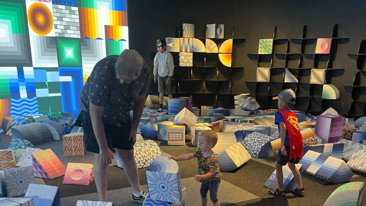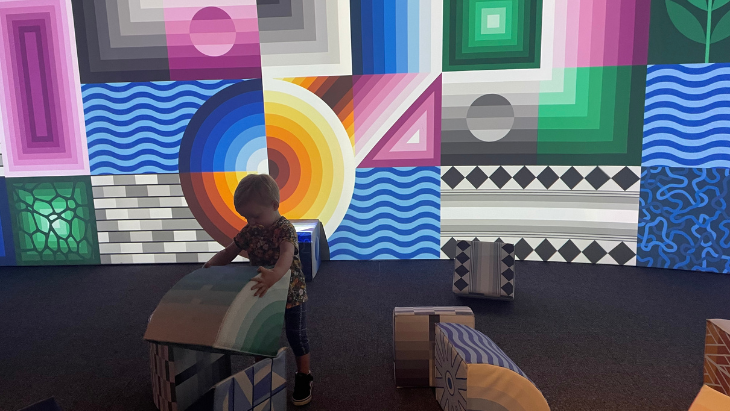 Featuring beautifully designed foam blocks (with patterns and colours symbolising the diverse playground that is the city of Sydney) that were roughly the size of my toddler, we had a lot of fun building towers (toddler had a lot of fun demolishing said towers) and exploring the way shadows projected onto the wall at the front of the room. We could have easily spent an hour here, but we had more to see!