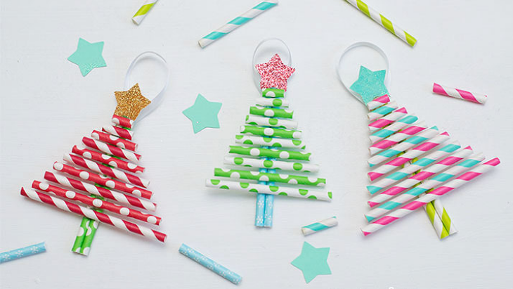 Simple but effective - cut graduating lengths of festive paper straws and hot-glue them in length order onto another straw cut in half. Add a sparkly star to the top, and you're done!