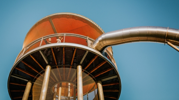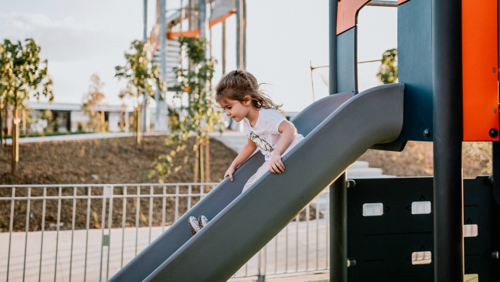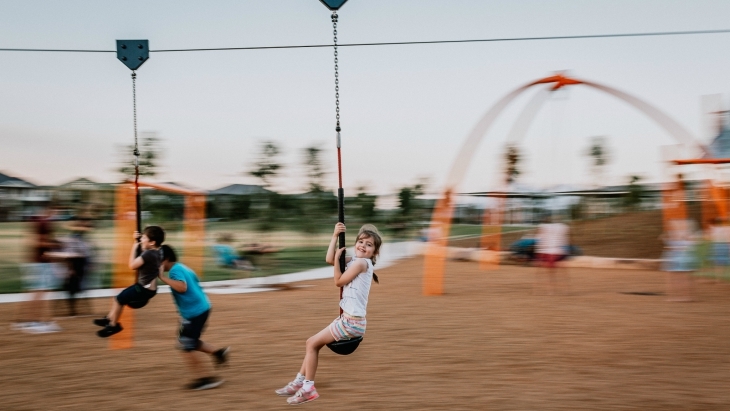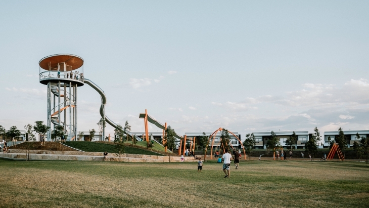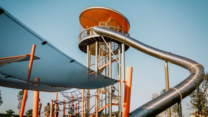 There is plenty for the older kids, including the park’s marquee feature, the 30m slide. The slide is accessed by climbing the stairs to the top of a tall tower, which gives sweeping views around the new housing estate and parklands, all the way to the Blue Mountains. Even if you don’t plan on going down the slide, it’s worth climbing to the top for the view alone. As well as the super slide, there is a decent ropes course, another smaller, but faster slide, flying foxes, a nest swing and another set of regular swings.