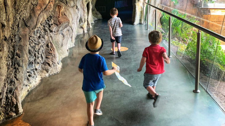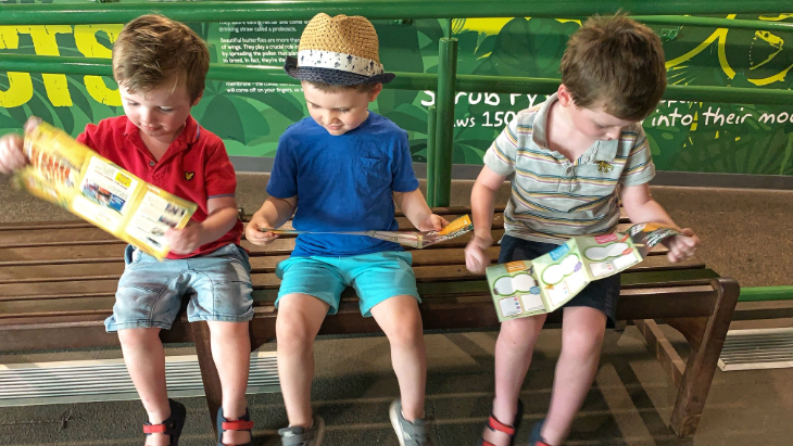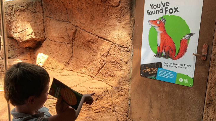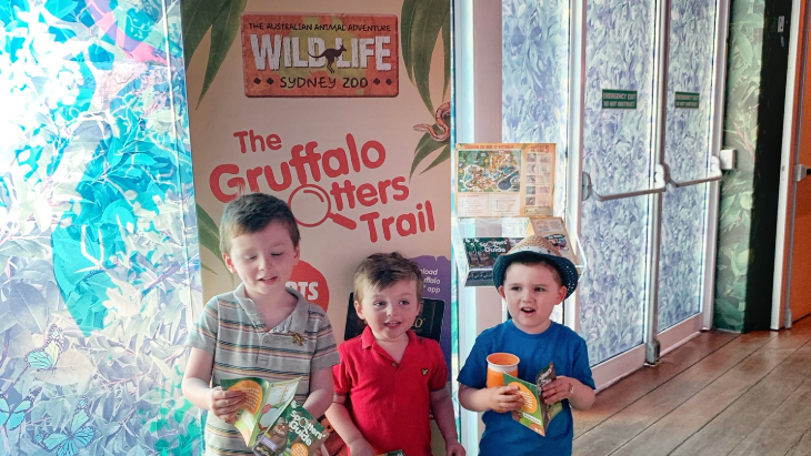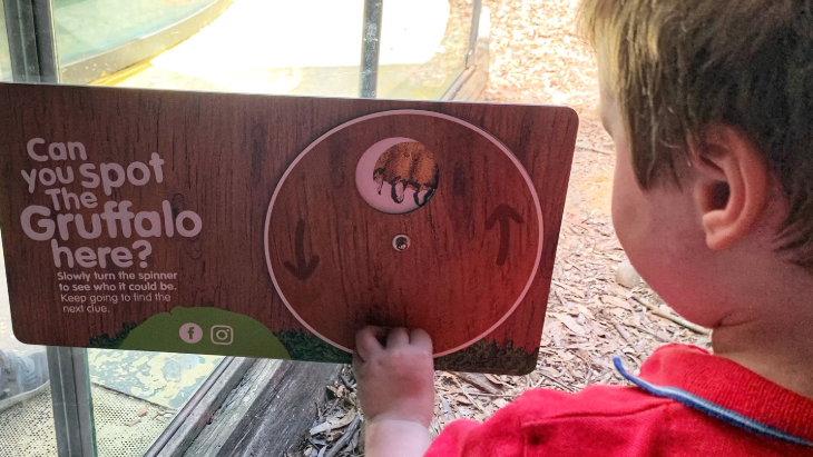 My friend and I prepped our boys the night before by rereading The Gruffalo, a firm family favourite. When we arrived at WILD LIFE Sydney Zoo, the kids each got an activity book they could fill in as they found different clues along the trail. There was always a bit of excitement when one of the characters was found, sometimes in an exhibit behind an animal. Along the way there were also a few hands-on activities such as a wheel the kids could turn and see parts of the Gruffalo’s face. These could all be recorded on the activity book.