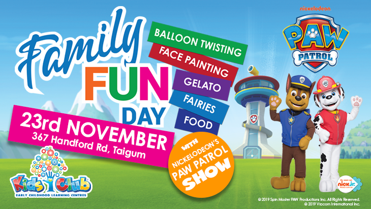 In celebration of the opening of Kids Club's new premiere Brisbane child care centre in Taigum, they are bringing Nickelodeon's PAW Patrol Show to the local community! Best part; its FREE! That means a live show to entertain the kids, along with an up close and personal meet & greet with the your favourites Marshall, Chase & Ryder. There will be face painting, food stalls and so much more!