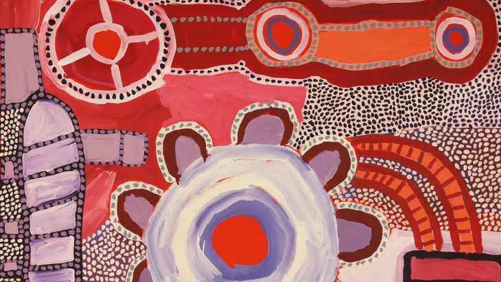 Puna Yanima is a respected senior Anangu woman who has a strong connection to country and traditional law, as well as a deep knowledge of nma (ceremonial music and dance). Linda Puna’s paintings combine Tjukurpa (foundation of Anangu life and society) with day-to-day observations, incorporating objects such as 4WDs, houses, windmills and water tanks. Remarkably, Linda is the first Anangu woman to live in a remote community whilst being dependent on a motorised wheelchair. She shares her joyful and unique perspective through bold brush strokes and strong colours, bringing to life the reality of remote community life.