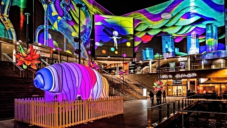 A series of vibrant projections will also flood the exterior of The Concourse with mesmerising light art in changing shapes, colours and patterns. The iconic roof will come to life as a dynamic canvas for a diverse, changing series of projection artwork nightly from 6pm to11pm.
