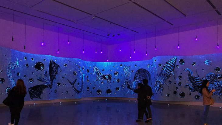 Entitled ‘Maniac Universe’, the scroll-like painting boasts phosphorescent elements that glow white and purple and ultraviolet lights. The piece is made up of oversized paintings that depict a linear procession of animals along the bark paper, including a bat, a chicken, a lobster, a horse, and a grasshopper; reminiscent of the Chinese Zodiac.