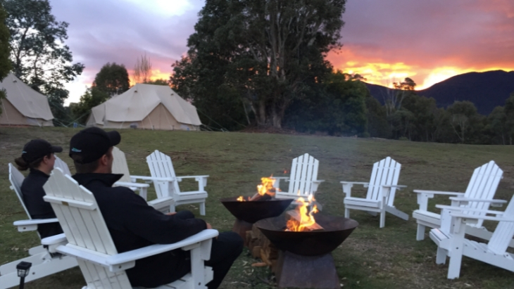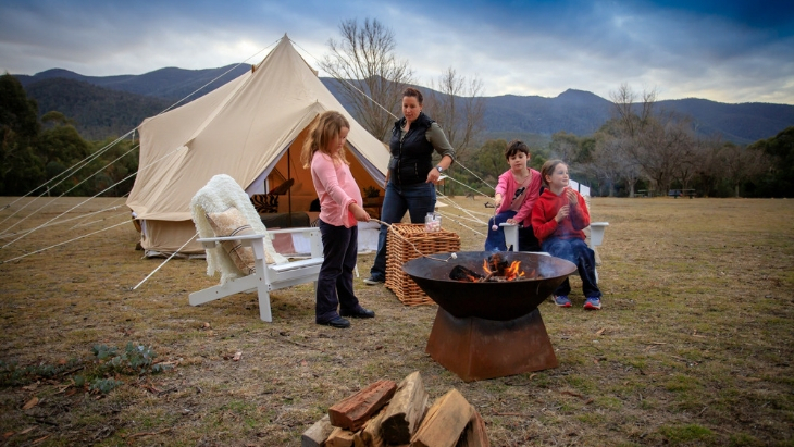 Glamping guests experience one of the sample itineraries and stay in a 6m Emperor bell tent—which includes real beds, a quality linen package, luggage rack, bedside table with solar lights and more.