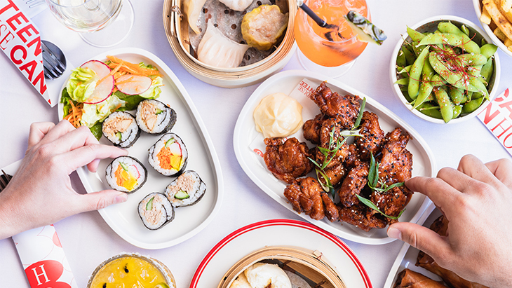 From lunch through to late, enjoy pan-Asian favourites like dumplings, pork buns, sashimi, poke bowls, karaage chicken burger and more. The kids' menu includes spring rolls, a mixed sushi plate, and chicken katsu with chips, of course.