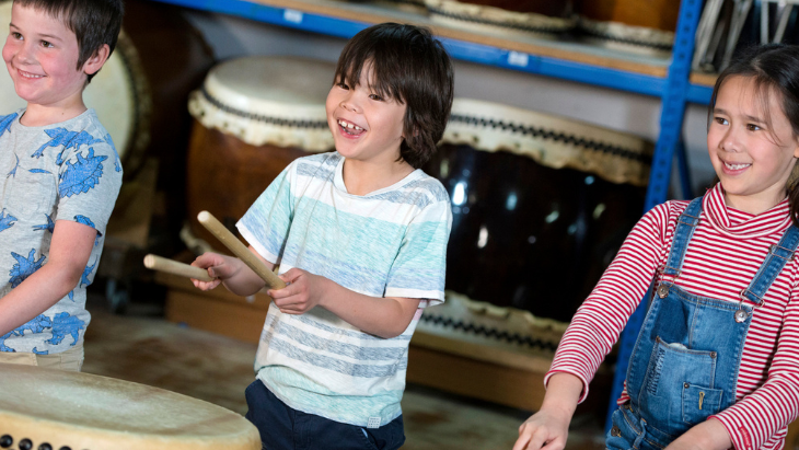 Introduction to music through taiko, rhythm and movement for 6 to 10 year olds. Musical games and learning short pieces of music are an important part of the Mini Beats experience. Key areas of learning are: maintaining a beat, sequencing and pattern-making, developing aural memory, kinaesthetic awareness and physical coordination