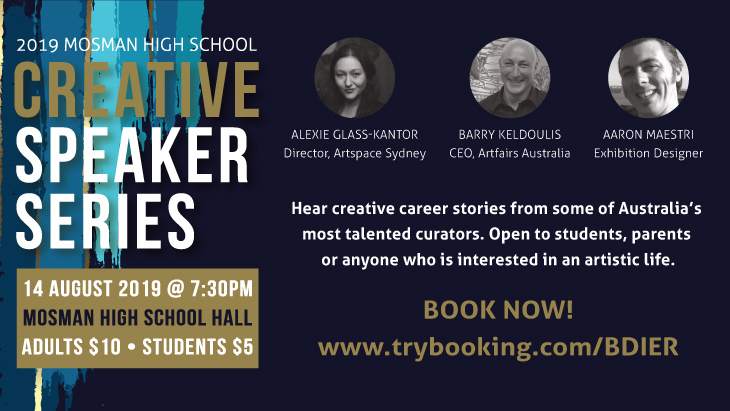 The theme for the August launch event is careers in curation and includes speakers Alexie Glass-Kantor (Director, Artspace Sydney), Barry Keldoulis (gallery owner and CEO, Artfairs Australia) and ex-Mosman High student Aaron Maestri (Australian Museum Exhibition Designer).