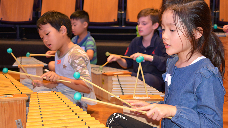 The participants in this level bring a diversity of musical experiences to class as some have started learning a specific instrument, but others have not. All students share equally in experiencing and making music. In the Blue class, conventional and graphic notation are explored, and a range of rhythmic and pitch concepts are used, they make music through 3-4 part ensemble playing and part singing. Building on solfege (singing with letter names) of previous levels, more challenging ensemble and aural activities are presented using voice, keyboard percussion and untuned percussion. Many participants in this level have already begun individual instrumental lessons but this is not a prerequisite.