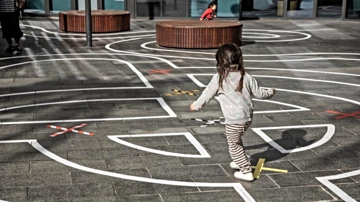 I’ll meet you here again is a labyrinth by artist Nadia Odlum is inspired by the historic labyrinth at Chartres Cathedral in France and reflects on the shifts in how people move through public spaces during COVID-19. Wentworth Point Community Centre and Library forecourt.