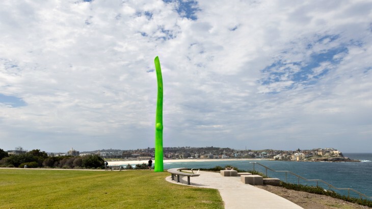 ‘Green Life’ is a tall, vibrant monolith that symbolises the birth of a new life. The commanding structure is unmissable in its temporary home in Marks Park on the end of the south Bondi headland, and will greet visitors as they meander down the Bondi coastal walk.