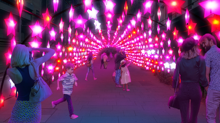 Starscape is a magical 40-metre tunnel of glowing lights that transforms Hay Street near The Goods Line into a galaxy-inspired wonderland.