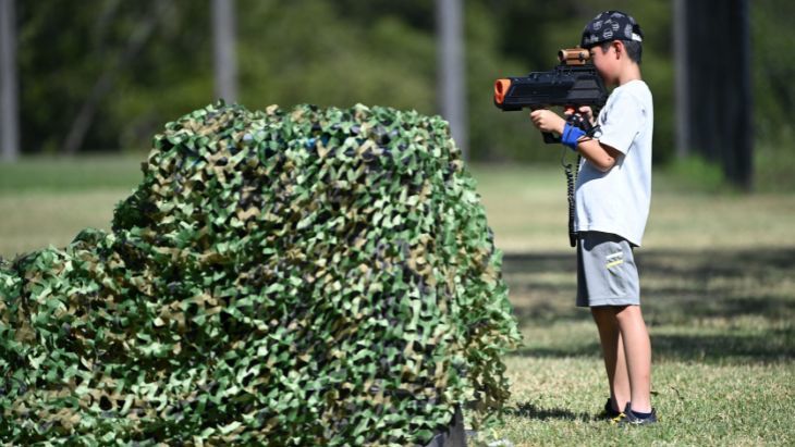 An outdoor battlefield with laser tag weapons, props and sound effects. Kids will hide behind blockade bunkers and walls, plotting with their team mates in a bid to defeat the opposing team in thrilling battles.